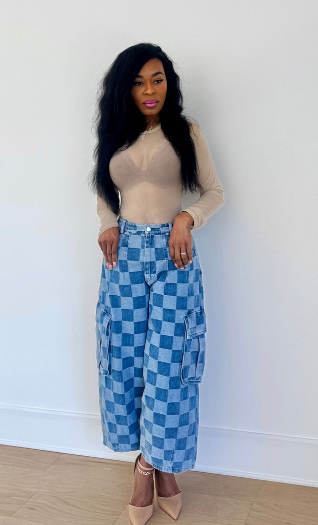 Barrel style jeans with checkered pattern