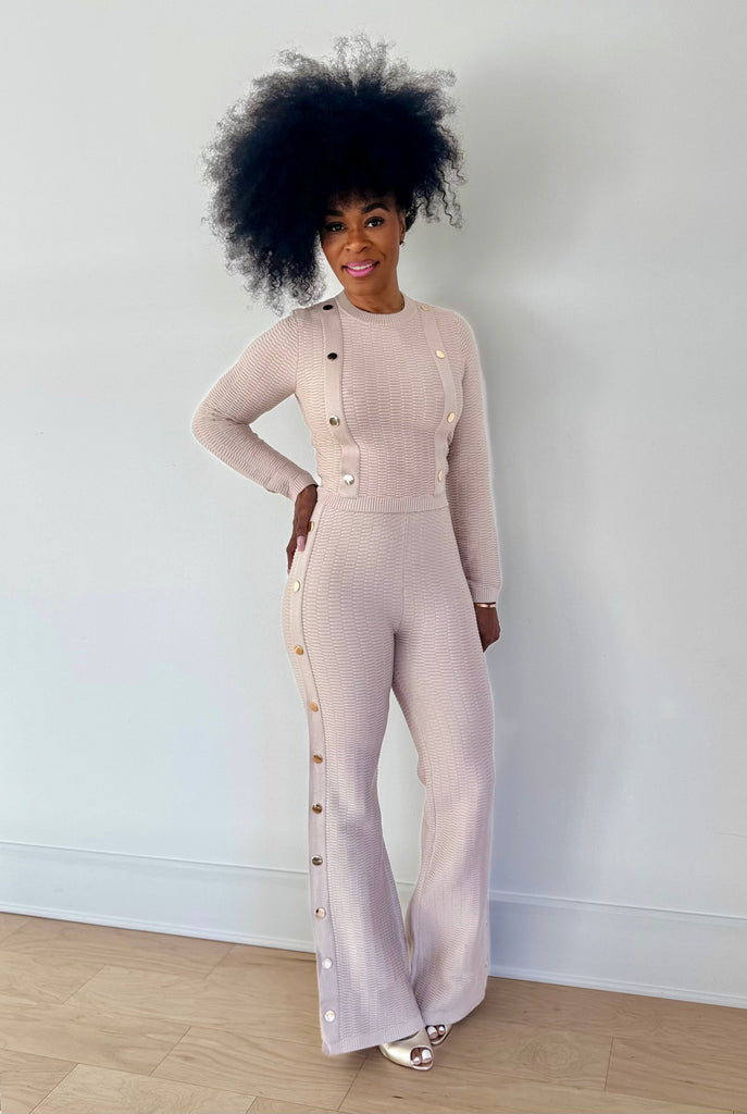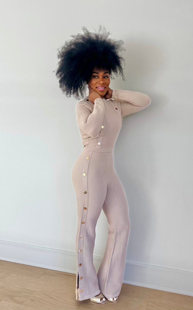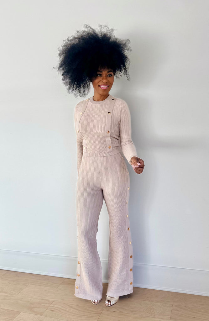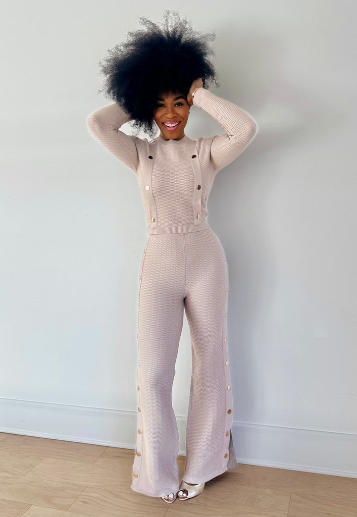 Two piece knit set featuring gold buttons and split legs