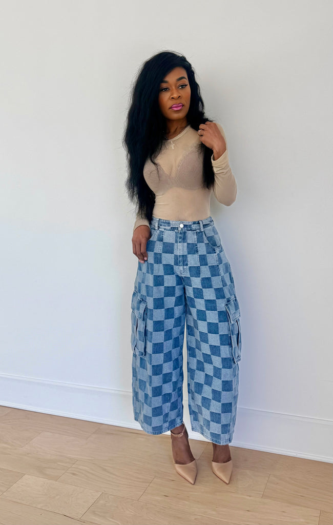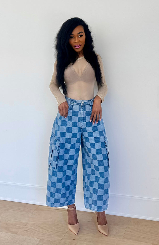 Barrel style jeans with checkered pattern